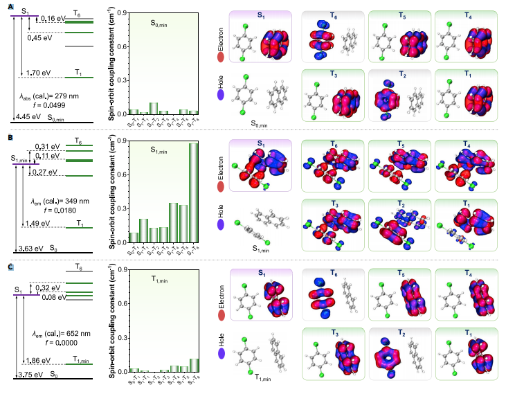 因为萘的激发谱与主体的激发谱存在很大程度的重叠,作者推测主体与客体在被紫外光激发后能同时处于激发态,而非发生传统的能量转移过程。作者通过详细的第一性原理计算(由刘峻恺博士完成),验证了萘分别和1,4-二氯苯、1,4-二溴苯在激发态存在的电荷分离和离域的簇激子属性,簇激子过渡态增加了ISC通道和自旋轨道耦合常数,大幅提高了RTP效率(图3)。