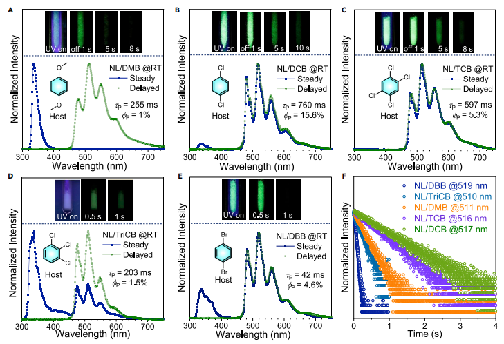 特别是在萘/1,4-二氯苯主客体组合中,萘的RTP效率超过了20%,同时绿色余辉长达10 s以上(寿命> 0.7 s),实现了不含杂原子的稠环芳烃的最优RTP综合性能。