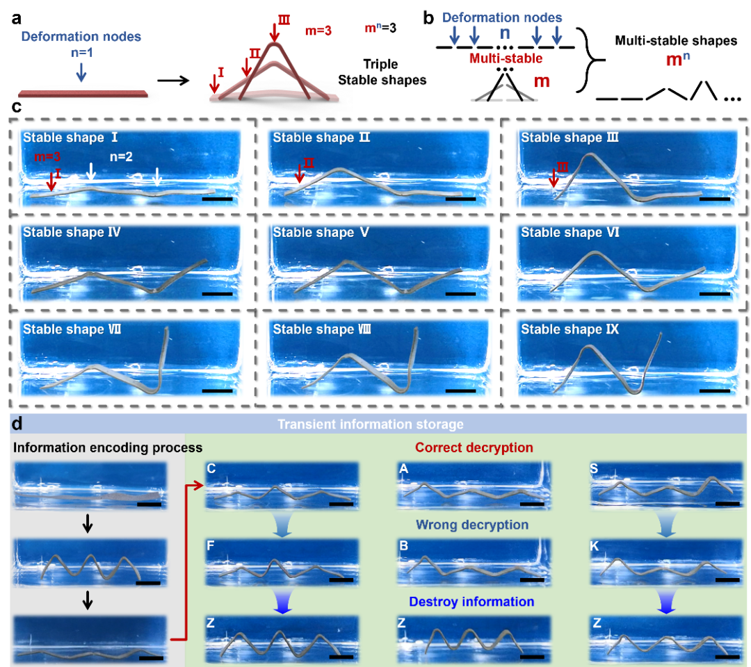 在日常交流的过程中,手语作为一种独特的无声语言可以利用手势变化连续地传递出不同信息,并且对于经过特殊编码的手势,未经专业训练的人无法解读其手语背后的信息。因此,这种基于形态变化的形态信息对于信息的加密、传递以及解密具有独特的优势(图1)。尽管智能形变材料可实现程序化变形,但其一次编程往往只能展现一种形态,因此试图通过形变材料来模仿手语从而进行大容量、可连续的形态信息传递依然是一个巨大的挑战。