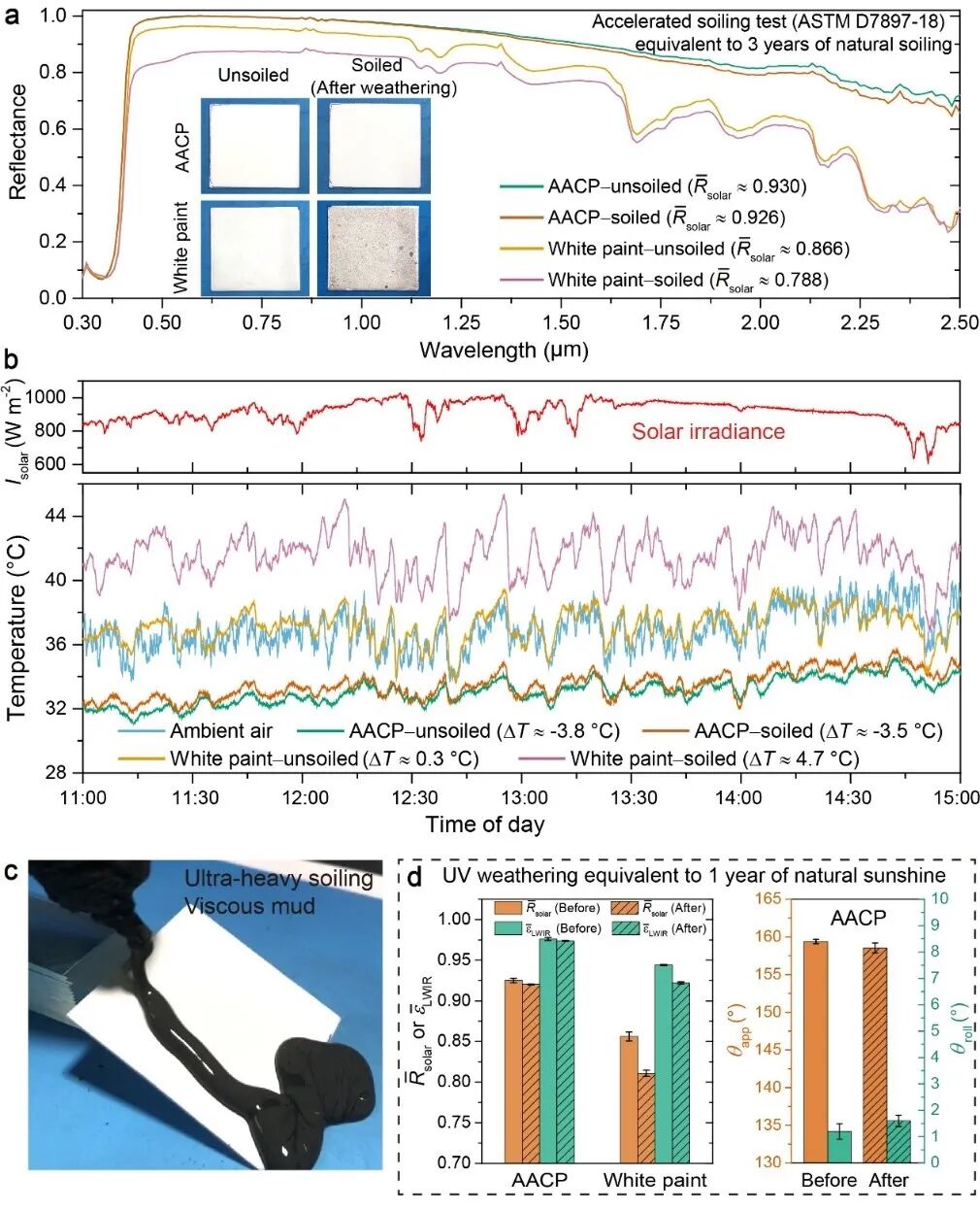图2. 抗老化辐射制冷涂层抗重污染和长期紫外线暴露的性能测试 (图片来源及版权:Nature Communications及论文作者)![]()
