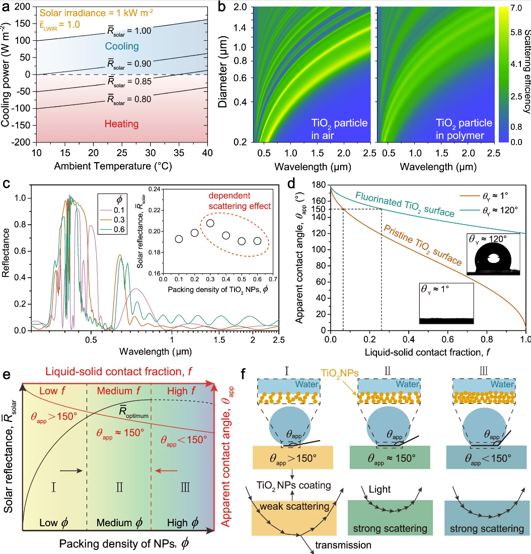 图1. 长效稳定日间辐射制冷涂层的设计 (图片来源及版权:Nature Communications及论文作者)该工作展示了一种兼具自降温和长效稳定性的设计策略,即使用具有抗紫外性能的多尺度二氧化钛纳米颗粒,通过蒸发驱动组装形成分级多孔形态,从而确保平衡的防污性能和高太阳反射率,生产抗老化的辐射制冷涂料基涂层。基于Cassie-Baxter模型和非润湿性理论,该涂层可以同时获得极低的表面黏附力,从而减少污染物积累并可以通过自然环境中的风力,雨水来实现自清洁功能。该研究还依照ASTM标准进行了相当于3年自然污染和1年自然阳光照射的模拟实验,测试后的涂层的太阳光反射率与测试前相比仅分别下降0.4%和0.5%,几乎不影响冷却性能。本文介绍的抗老化辐射制冷涂料具有可扩展性,可以喷涂在所需的室外建筑或大型集装箱外表面,提供持久的辐射冷却能力。进一步探索这种无机纳米颗粒的蒸发组装策略,该涂料还可以扩展到更广泛的材料,如碳酸钙、氧化铝、二氧化硅、硫酸钡和其他满足视觉舒适性的有色颜料,将这项技术推向现实世界的应用。![]()
