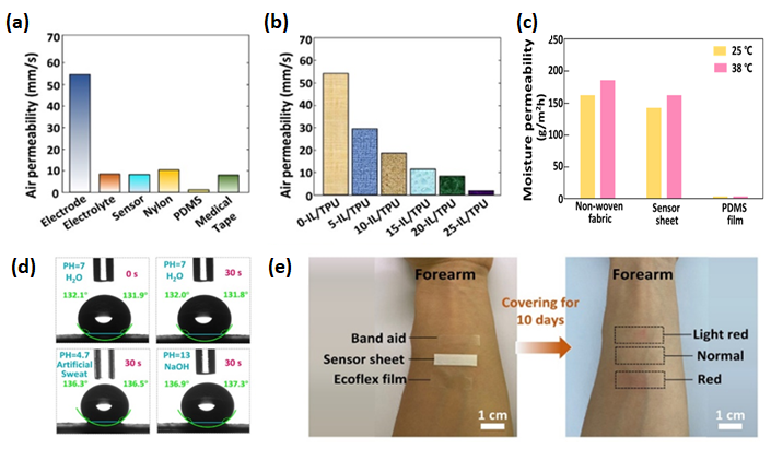 图3 全纳米纤维传感器的透气、透湿、疏汗与穿戴舒适性能:(a)纳米纤维电极、电解液、传感器与常见柔性材料的透气性比较;(b)全纳米纤维传感器透气性随IL含量的变化规律;(c)全纳米纤维传感器透湿性;(d)全纳米纤维传感器的疏液体性;(e)全纳米纤维传感器与创可贴、Ecoflex在紧密穿戴10天后的皮肤健康状态对比。由于整个传感器件构建在纳米纤维网络结构上,其微孔隙和通孔能够让气体和水分的分子自由通过,赋予了传感器件透气、透湿的新颖特性。传感器的透气性接近于尼龙布料和创可贴等日常织物,远高于常规柔弹性PDMS基底(图3a)。透气性的关键在于中间纳米纤维电解液层,随着IL含量的增加,其透气性呈现出下降的趋势。当IL含量为25%时,透气性明显下降且低于日常织物(图3b)。因此,20%IL含量为最优选择。在透湿性方面,传感器件与日常织物无纺布相似,且在室温和体温的温度区间内变化不大(图3c)。由于TPU本征的疏水特性,整个传感器件呈现出疏水珠(接触角大于130°)的新颖特性,且该特性在碱性溶液和人工汗液中都能得到很好的保持(图3d)。透气和透湿的特性保证了气体和水的分子在皮肤与外部环境中形成良好的微循环,疏汗的特性保证了皮肤分泌汗液不会对传感器造成侵蚀和损害。因此,全纳米纤维传感器展现出良好的生物相亲特性,即在紧密贴附皮肤10天后不会刺激皮肤产生红肿等不良过敏反应(图3e),且该性能要由于创可贴产品。![]()