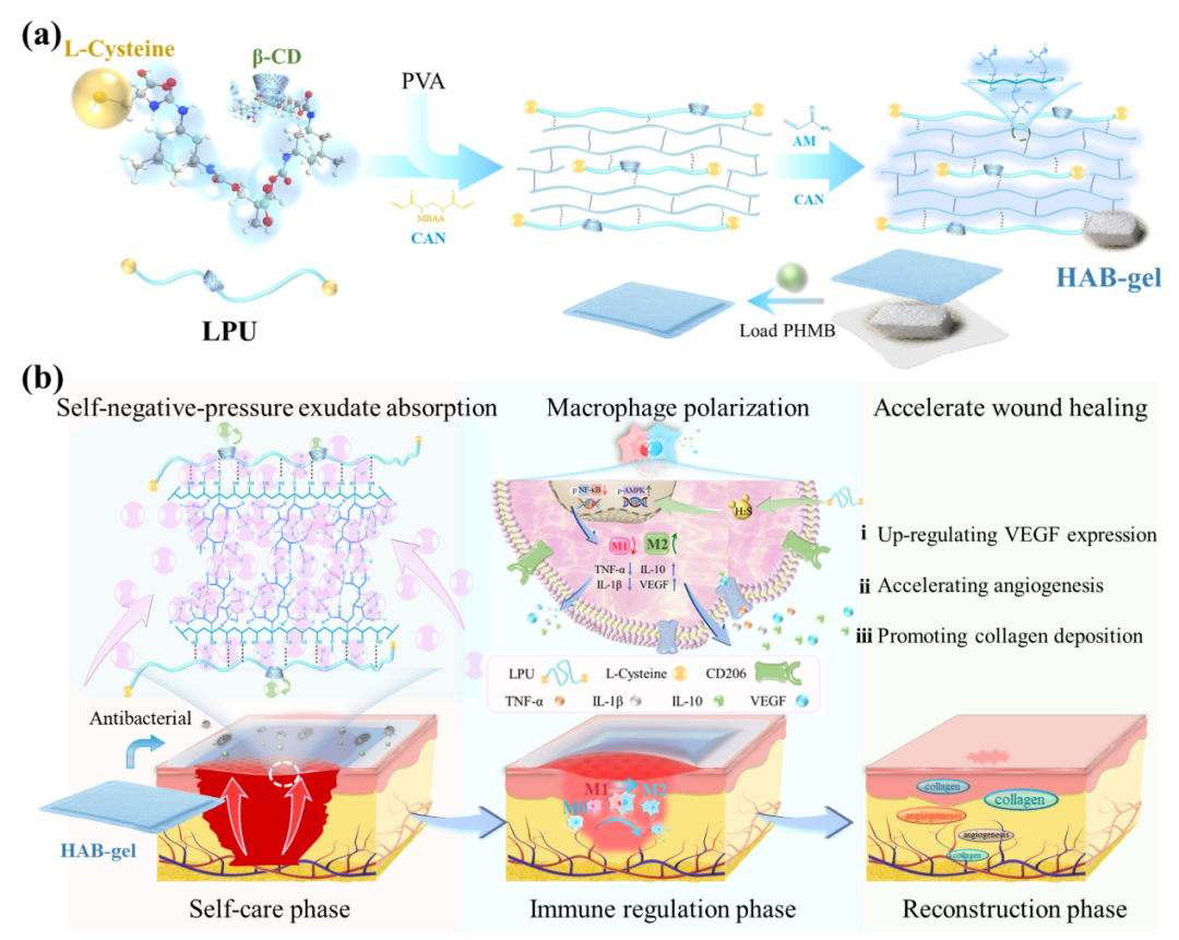 图1 采用协同策略构建的具有自负压渗液吸收、M2巨噬细胞极化和抗菌协同作用的水-气双相凝胶(HAB-gel)慢性伤口敷料
