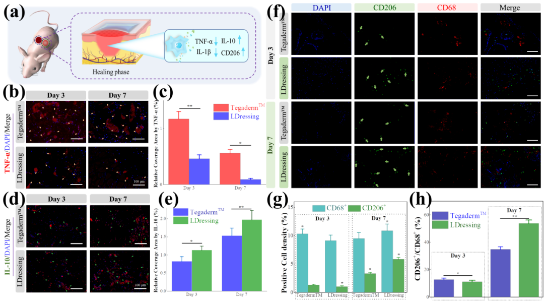 创伤修复的研究是一个热门领域,由于伤口微环境的代谢紊乱,慢性多渗液伤口的临床治疗仍然面临极大挑战。伤口微环境的复杂症状主要归因于三个原因:渗出物污染、细菌感染和免疫调节障碍。所以,及时清除伤口渗出液、消除细菌感染、刺激血管生成和胶原蛋白沉积是成功治愈慢性伤口的关键。这需要采用新的有效策略开发多功能慢性伤口敷料来同时解决这些问题。
