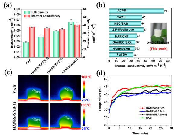 图1. HANRs/SAB气凝胶的制备工艺形貌和性能特征。