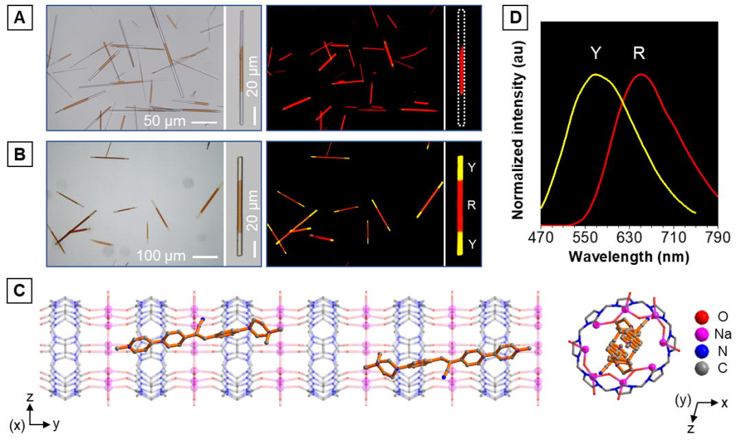 图1:CB[8]和NaBr溶液中加入AIEgen 客体前后形成的微棒的单晶结构该研究通过溶液挥发的方法制备了两种荧光三嵌段微棒(图2)。在高湿度缓慢挥发条件下,R末端形成了无荧光N段(N-R-N);而在中等湿度稍快挥发的条件下,R末端形成了黄色荧光的Y段(Y-R-Y)。Y的单晶结构证明CSPP分子以单体形式分布在CB[8]-Na+纳米通道中。Y段和R段的最大荧光发射波长分别为570 nm和650 nm。前线分子轨道和势能面分析解释了两者的荧光发射区别。利用荧光光谱,紫外可见吸收光谱,荧光寿命以及荧光成像分析了多级超分子自组装的机理。在溶液挥发的过程中,NaBr被浓缩。由于金属阳离子可以与有机客体竞争结合葫芦脲的端口,因此高浓度Na+会破坏CSPP与CB[8]的络合。但是CSPP dimer@CB[8]结合非常强,高浓度NaBr(甚至到5 M)只能部分解离CSPP dimer@CB[8]-NaBr 超分子聚合物,形成少量CSPP assembly。而CSPP monomer@CB[8]结合非常弱,在高浓度NaBr溶液中非常不稳定。只有当CB[8]浓度达到饱和时,CSPP monomer@CB[8]-NaBr 超分子聚合物才会被驱动形成并结晶成Y嵌段。CSPP assembly正好作为CSPP的储存库,在条件成熟时释放出CSPP用于制备Y嵌段。![]()