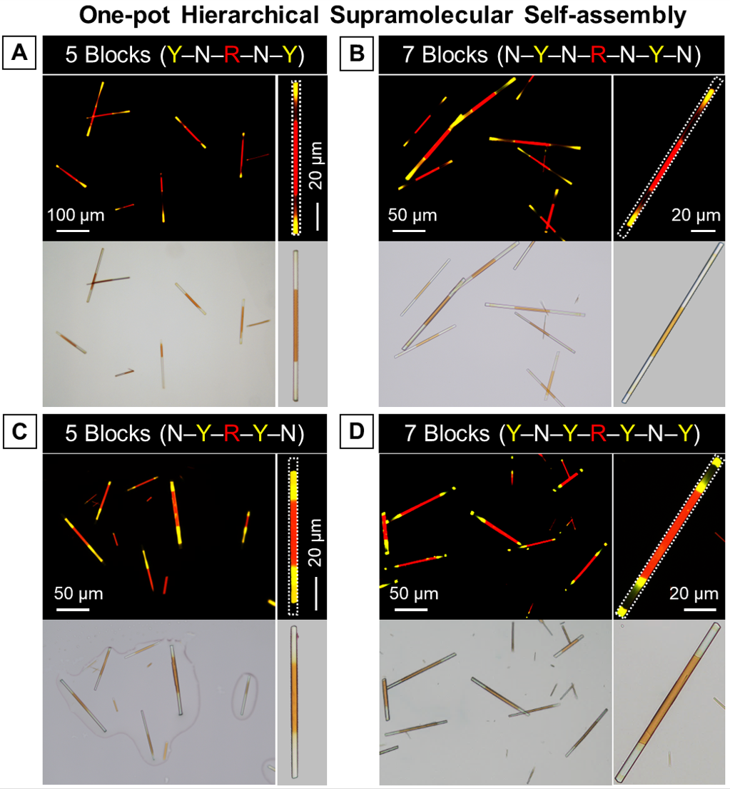 图2:N-R-N和Y-R-Y荧光三嵌段以及Y段的单晶结构该研究进一步通过控制环境湿度,溶液挥发条件,以及CB[8]浓度和相对比例,实现了一锅法制备N–Y–R–Y–N和 Y–N–R–N–Y 5嵌段荧光微棒,以及 Y–N–Y–R–Y–N–Y 和 N–Y–N–R–N–Y–N 7嵌段荧光微棒(图3)。这是因为Y嵌段形成的条件比较苛刻。CSPP assembly的形成和解离平衡控制着CSPP 的供应,CB[8]达到饱和浓度才能驱动其结晶。如果这些条件有一个不满足,Y段就不会生长,而只会增长N段。因此,就会形成Y与N交替出现的嵌段结构。另外,该研究也可以通过逐步种子法制备多嵌段荧光微棒。![]()