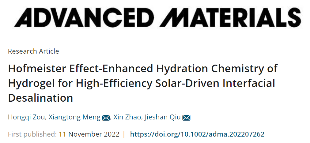 图2. PMH的结构表征和热管理。a)溶胀前(上)和溶胀后(下)PMH的数码照片和接触角测试。PMH在b)低放大倍数和c)高放大倍数下的SEM图像。d)动态力学分析显示PVA水凝胶和PMH的存储模量(Gʹ)和损耗模量(Gʺ)。PVA、MNC和PMH的e)FTIR光谱和f)UV–vis–NIR光谱。g)一个太阳光下PMH/PS表面(黑色曲线)、PMH/PS水体(蓝色曲线)、PS水体(红色曲线)的温度变化(插图:光照时间为0、15、60min时PMH/PS蒸发器表面温度分布红外图像)。h)一个太阳光下PMH蒸发表面的稳定温度。i)COMSOL模拟PMH漂浮在水面时的温度分布。(2)在模拟海水(3.5 wt% NaCl)中,Cl-表现出相对较弱的破坏PVA上-OH之间氢键的能力,以及相对较强的促进疏水相互作用的能力。这使得PMH2蒸发器在模拟海水中表现出比在纯水中更高的蒸发能力(图3d,e)。图3. PMHs的太阳能驱动界面脱盐性能。a)PMHs的饱和含水量。b)PMHs的膨胀时间和水传输速率。c)一个太阳光下,PMHs在模拟海水中的质量变化随光照时间的函数关系。一个太阳光下,PMH2在不同浓度NaCl溶液中的d)质量变化和e)蒸发速率,能量效率。f)PMH2在一个太阳光下在模拟海水中的脱盐性能与已报道文献的对比。首先,Cl-作为Hofmeister离液离子,能够破坏PMH蒸发器中PVA上-OH之间的氢键,暴露出来的-OH与水分子结合产生更多的中间水以加快水分的蒸发。这种能力随着Cl-浓度的增加而逐渐增强(图4d-g)。其次,Cl-还具有促进PVA上疏水基团(C-C)之间的疏水相互作用的能力,使疏水基团之间相互靠近,形成新的物理交联点以及更加有序的孔道结构,促进水分传输。这种能力随着Cl-浓度的增加而逐渐减弱(图4h)。图4. PMH2中离子诱导的水活化行为。a)分别在纯水和3.5 wt% NaCl溶液中充分溶胀的PMH2的拟合Raman光谱。PMH2在不同浓度盐水中的b)IW/FW比值和c)Raman光谱。d)表征在PMH2在不同浓度盐水中熔化行为的拟合DSC曲线和e)对应的IW/FW比值。f)在不同浓度NaCl溶液中溶胀后的PMH2干凝胶的XRD图谱。g)在不同浓度NaCl溶液中溶胀后的PHs(PVA水凝胶)干凝胶的ATR-FTIR光谱。h)在不同浓度NaCl溶液中充分溶胀的PMH2的压缩应力-应变曲线。i)X-、PVA与水相互作用,以及盐离子与PMH相互作用的示意图。j)PMH2在水,以及摩尔浓度为0.6的NaCl、NaNO3和NaI溶液中的质量变化(一个太阳光)。进一步,采用密度泛函理论模拟证明了Cl-与PVA之间的这两种相互作用方式(图5)。图5. Cl-与PVA之间相互作用的理论模拟。a)PVA(n=2)在(Ⅰ)水和(Ⅱ)NaCl溶液体系中的分子结构模型。b)水体系中PVA分子链上的分子间-OH之间形成(Ⅰ)氢键(O1-H1)的ICOHP和NaCl溶液中PVA分子链上的-OH之间(Ⅱ)O1…H1的ICOHP。c)PVA疏水链之间在(Ⅰ)水、(Ⅱ)低浓度NaCl溶液和(Ⅲ)高浓度NaCl溶液中的平均距离和结合能。(3)得益于Cl-与PVA之间的Hofmeister效应以及PMH2的高含水量,使得PMH2在模拟海水中具有优异的耐盐性和自清洁能力。在连续21个小时的耐盐测试中,PMH2蒸发器能够实现2.9 kg m-2 h-1的平均蒸发速率。蒸发器表面在第12个小时有盐结晶析出,最终形成的盐结晶在黑暗条件下80分钟完全溶解(图6a)。图6. PMH2的耐盐性以及在自然光下的脱盐测试。a)一个太阳光下,PMH2在模拟海水(3.5 wt% NaCl溶液)中的蒸发速率。插图为PMH2蒸发表面盐结晶的积累和再溶解的数码照片。b)2022年3月14日(北京)不同时间下室外太阳辐射强度和环境温度变化。c)2022年3月14日(北京)8:00-17:00期间PMH2的室外太阳能海水淡化蒸发性能。d)海水脱盐前后的盐度测量。e)使用万用表测量海水、纯化后的水和自来水的电阻。f)实验室废水和纯净水的UV-vis光谱。插图为净化前后废水的数码照片。论文第一作者为北京化工大学化学工程学院硕士生邹洪棋,论文通讯作者为北京化工大学化学工程学院邱介山教授和孟祥桐副教授。该研究得到中央高校基本科研业务费专项资金、国家自然科学基金,以及精细化工国家重点实验室的资助支持。邱介山,北京化工大学化学工程学院教授,博士生导师,国家杰出青年基金获得者、教育部长江学者特聘教授、全国化工优秀科技工作者、全国百篇优秀博士论文指导教师、石油和化工行业新型碳基功能材料重点实验室主任。现任中国科协先进材料学会联合体主席团副主席、《化工学报》及Battery Energy副主编、Chemical Engineering Science、Science China Materials、Energy Technology等20余种学术刊物编委。长期从事材料化工、能源化工等领域研究,在功能碳材料的设计构筑、煤炭的高效高值转化利用技术和理论、太阳能电池/超级电容器/钠(钾)离子电池的关键材料设计等方面,取得了系列的创新成果;获教育部自然科学一等奖、辽宁省自然科学一等奖等奖励和表彰20余次。在Nature Mater., Adv. Mater., Energy Environ. Sci., Nature Commun., Angew. Chem., JACS等刊物上发表论文800余篇,论文总被引43800余次, h指数102 (web of sci.);申请及授权发明专利140余件,多项技术实现了工业化/规模化应用,创造了显著的经济效益和社会效益。自2018年始,连续入选“科睿唯安”全球高被引科学家榜单;2019-2021年连续入选Elsevier中国高被引学者榜单(化学工程)。入选全球顶尖前10万科学家榜单(全球排名1596位,2022年4月)。