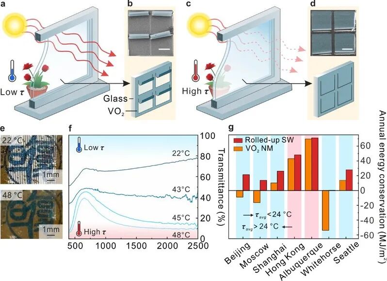 图1:低温下卷曲智能窗的宏观示意图(a)和微观示意图及相应的SEM图像(b),高温下卷曲智能窗的宏观示意图(c)和微观示意图及相应的SEM图像(d),比例尺:100μm;卷曲智能窗高低温下的光学照片(e)及其可见光和近红外光透光率变化(f);卷曲智能窗和平面薄膜智能窗在不同城市中的年平均节能量模拟对比图(g)。研究团队发展的卷曲智能窗在可见到近红外波段实现了随温度改变的多级太阳光透过率调制(e和f),并得到极高的太阳光调制率(42.14%)和可见光透过率(61.01%),这使得该智能窗具备了在不同温度,不同气候,不同时段高效自适应调节室内温度的能力。研究团队利用全球气候数据库与模拟软件,对不同气候类型的典型城市中装配卷曲智能窗、平面薄膜智能窗与普通玻璃的房屋进行了全年能耗(包括照明、供暖和制冷)的模拟(g),由于卷曲智能窗具有比较高的太阳光调制率以及低温下良好的太阳光透过率,无论在常年炎热的环境还是四季严寒的环境,都具有比较优异的节能效果。该工作将智能二氧化钒薄膜材料的热致形变能力与热致色变能力创造性地结合在一起,突破了传统平面薄膜难以兼顾透光率、节能效率和多环境适应性的难点,为新一代的高效智能窗提供了一种新的可行性思路。该研究工作得到了国家重点研发计划、国家自然科学基金、上海市科委、中科院青年创新促进会等项目的资助和支持。