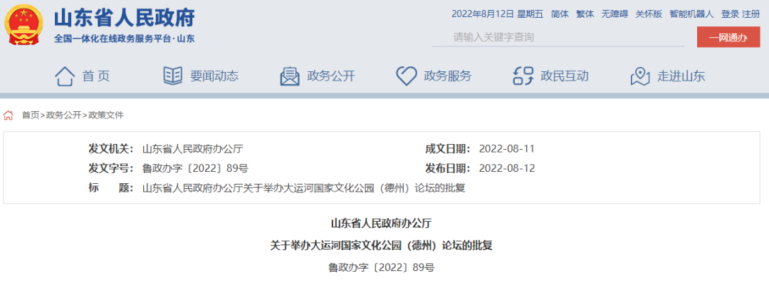 你市《关于举办大运河国家文化公园(德州)论坛的请示》(德委〔2022〕135号)和《关于调整大运河国家文化公园(德州)论坛有关事项的请示》(德政函〔2022〕42号)收悉。经省政府同意,现批复如下: