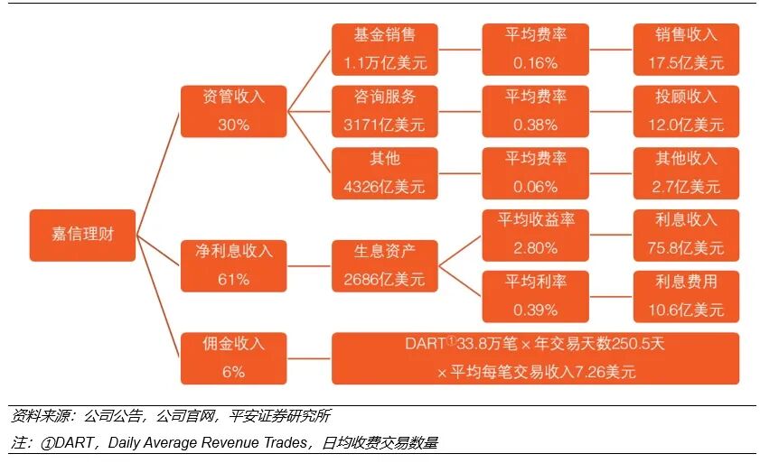 根据全球知名财富管理机构嘉信理财(Charles Schwab Corporation)的2019年年报,嘉信理财目前营收中由AUM驱动的收入(包括净利息收入和资产管理收入)贡献分别为61%、30%(交易佣金收入贡献仅为6%)。也就是说,资管收入占3成,其中这块收入又可以主要分为基金销售和咨询服务两大板块。