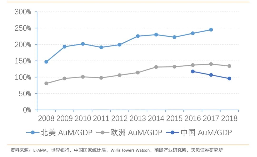 其次看AUM/GDP 值。数据显示,我国 AUM/GDP 值显著低于国外。