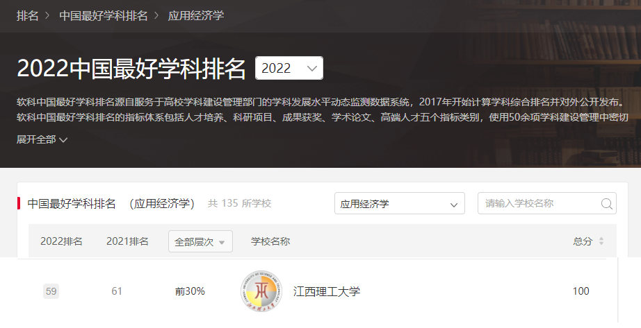 2022软科中国最好学科排名榜单公布,我校经济管理学院应用经济学位列第59名,同比前进2名,再次进入前30%。至此,我校应用经济学2020-2022连续三年位列软科中国最好学科排名前30%。