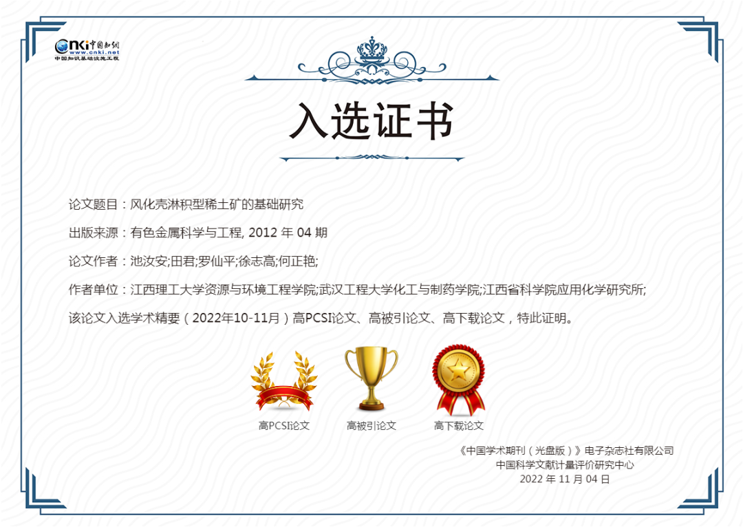 中国知网《学术精要数据库》发布,我校主办的《有色金属科学与工程》《江西理工大学学报》两刊共有94篇论文入选《学术精要数据库》高影响力论文。据悉,《学术精要数据库》来源于中国知网资源总库中2011—2022年的各学科高PCSI(论文引证标准化指数)、高被引、高下载的期刊和会议论文。其中《有色金属科学与工程》在中国知网学术精要论文文献评价中共检索到61篇高影响力论文(高PCSI论文34篇,高被引论文34篇,高下载论文40篇);《江西理工大学学报》共检索到33篇高影响力论文(高PCSI论文11篇,高被引论文16篇,高下载论文13篇)。