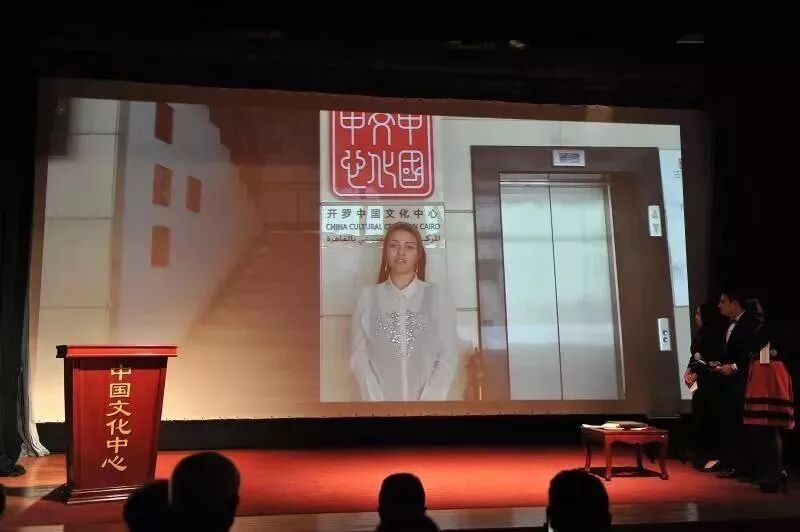 中国驻埃及使馆文化参赞兼开罗中国文化中心主任石岳文先生将奖牌与证书交予米拉·艾哈迈德