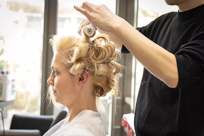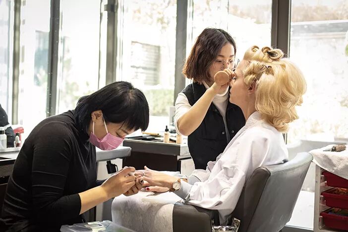 Monroe was known for her natural demure look, made to pop with her signature red lips, and eyes that laughed beneath bold lashes and the flick of black eyeliner. The salon’s in-house makeup artist was simply shown the look we were going for as inspiration and was able to help Scott embody the Monroe aesthetic.