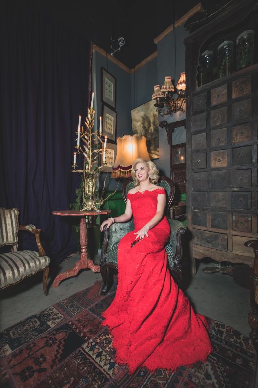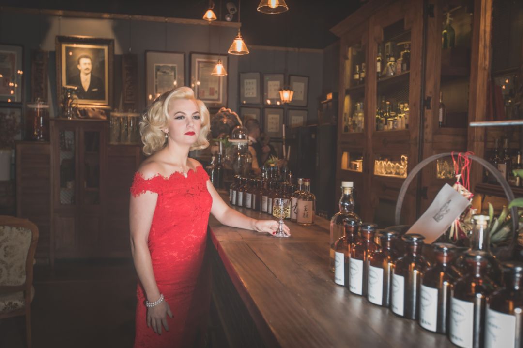 The wow factor – the red cocktail gown kindly loaned to us by LOVA Weddings – added the glitz we were looking for, and handmade jewelry by Antonia Sampson the class. Award-winning jewelry designer Sampson chooses the best pearls for her discerning customers. Each pearl is hand selected and carefully picked out from some of the best suppliers in Asia. Scott beamed in pearls on the ears, wrist, and neck, and was Christmas cocktail party ready! Then we were off to a swanky, nearby cocktail bar named Herbal to take some glamour shots.