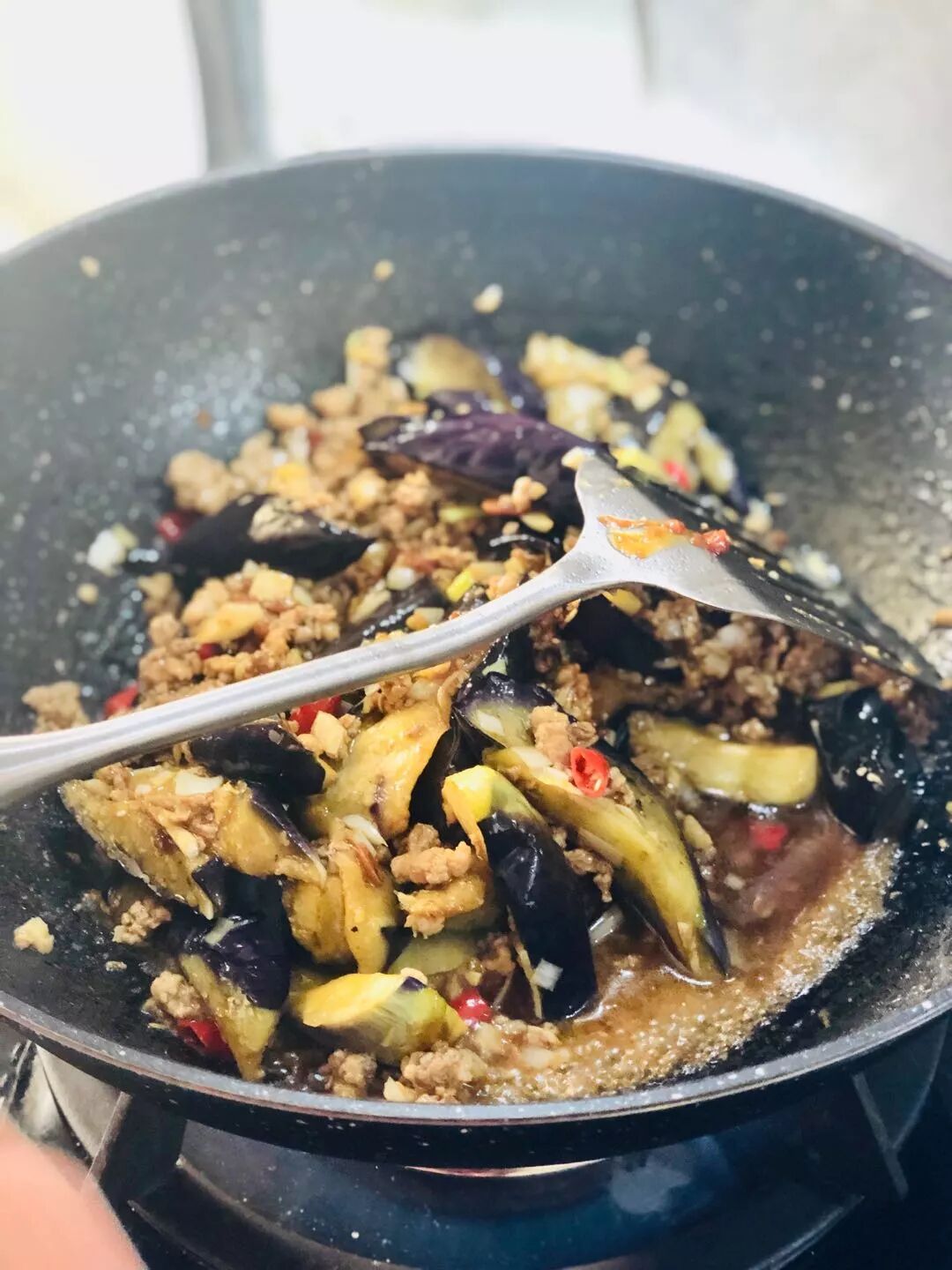 Add the soybean paste, garlic and onion to the wok. Stir-fry for a few minutes and then add the eggplant and continue to stir-fry for a few minutes to combine all the ingredients. Add the sauce mixture.