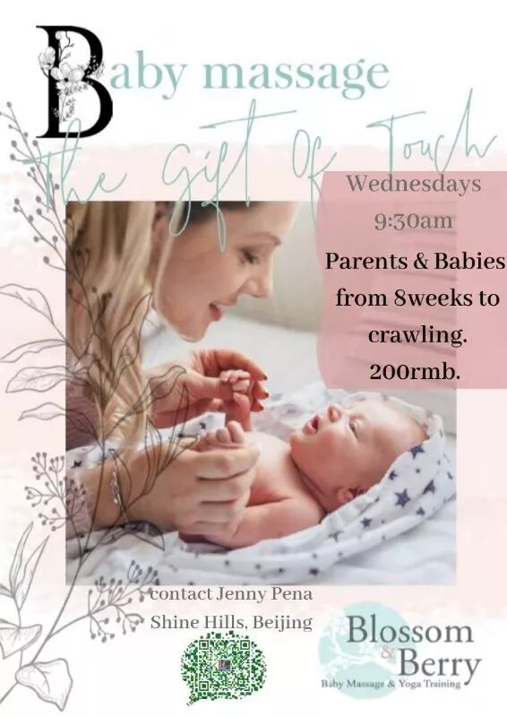 Parents and babies 8 weeks to crawling. Blossom and Berry Baby Massage and Yoga Training invites parents and young babies to join them on Wednesdays for a baby massage class. Learn the importance of touch and what massage can do to help your baby’s health. Class only occurs if more than 2-3 people sign up. Please contact Jenny Pena on WeChat for information on when this class takes place and location.