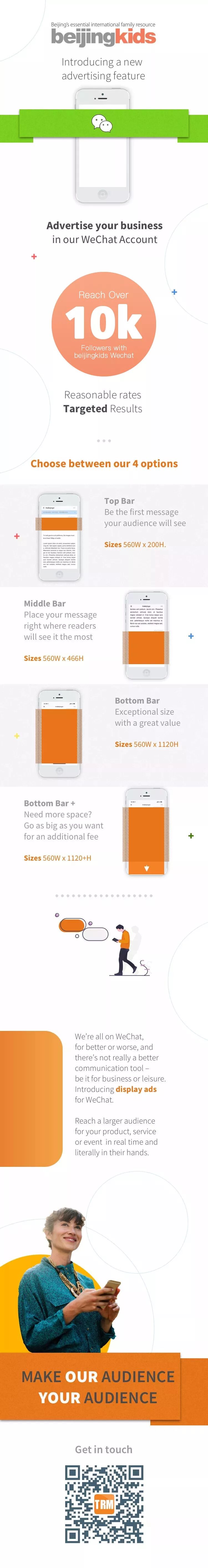 With over 10,000+ subscribers and 4,000+ weekly reads, beijingkids’ WeChat account reaches a premium slice of the city’s international community. Our typical readers include international families who have made Beijing home and well-to-do Chinese who live an international lifestyle. Now you can reach them too, in real time, and literally in their hands.