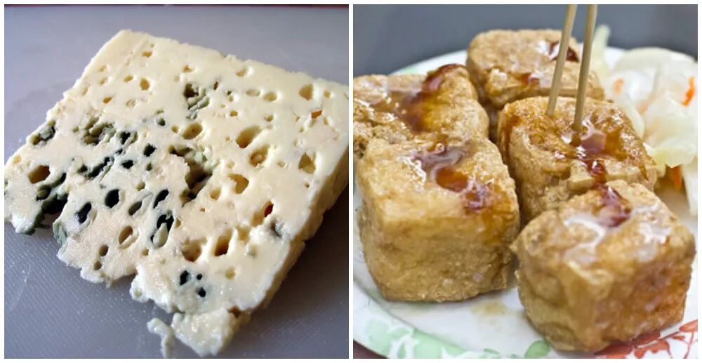 Delicious stinky Roquefort cheese (left) and squares of chòu dòufu