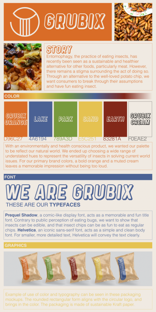 Next up, we have Lucas Hsu. For his project, he posed as a graphic designer and created a brand identity for insect snacks. “Entomophagy, the act of eating insects, utilizes less water and land resources, reduces greenhouse gas emissions, is rich in nutritional value, and could potentially be an accessible food alternative in underdeveloped or developing countries,” he states. “To effectively showcase the brand and the goals to the customer, I will be developing a brand identity that is both visually impactful and connected to our brand values.” By creating a brand style guide, he hopes to guide designers in the process of making branded products such as advertisements, websites, or packaging.