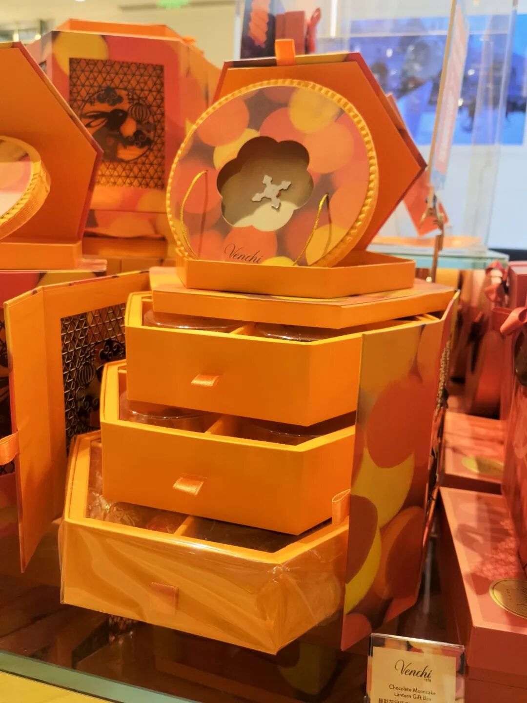 Like everything else at Venchi, this one is going to cost you an arm and a leg. The three-layer mooncake box is a veritable display case all its own. Layers of chocolate mooncakes sit above a layer of various Venchi chocolate, plus an orange Venchi branded paper lantern to quite literally top the whole thing off.