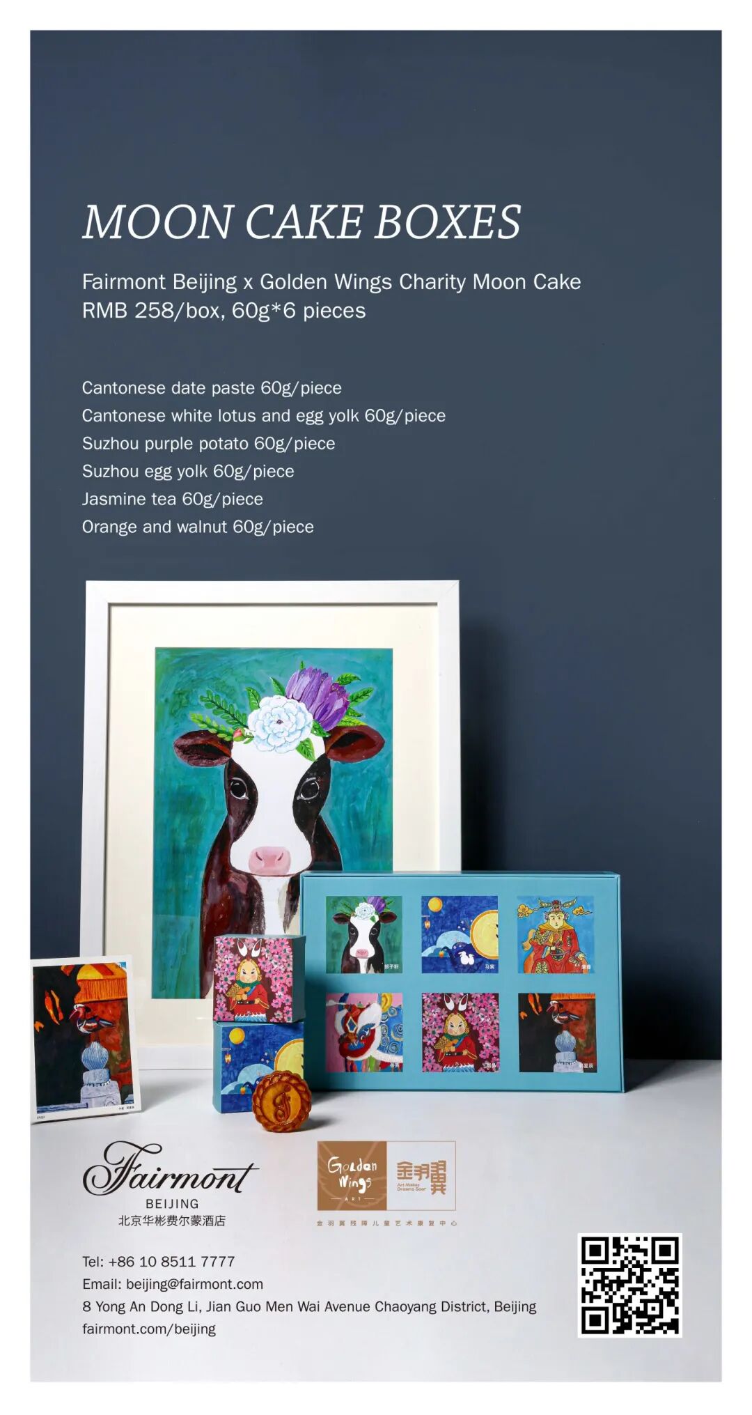 From now until the end of August artwork by the Golden Wings Art Rehabilitation Center students who designed this year's Fairmont Beijing mooncake boxes will be on display.