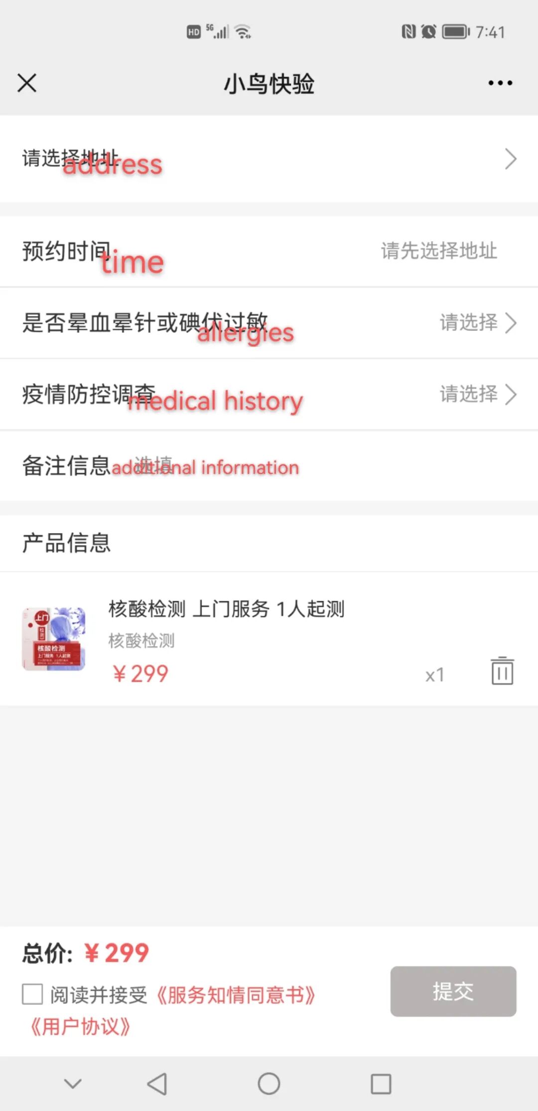 When you arrive at the mini-program, select the nucleic acid testing door-to-door service. The cost is RMB 299 per person. The interface is only in Chinese and just a tad complicated. If you don’t read Chinese, consider having a native speaker help you.