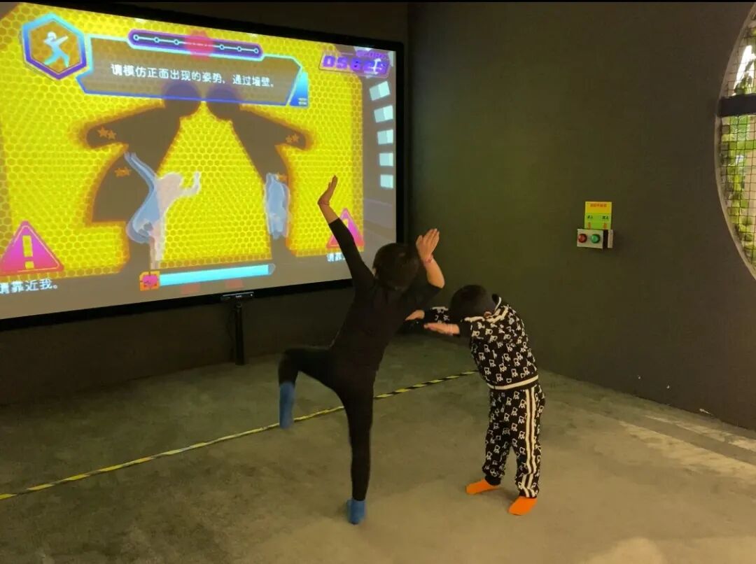 Under the second category, Bom Bom’s arsenal of games has expanded to include some cool new MR options like archery, golf, hunting, and the roll-a-ball game where you’re physically rolling a huge yoga ball, which appears as a boulder onscreen. There’s also a high-adrenaline cooperative MR game where you can pair up with your kid or bestie and try to match the challenge shown on the screen. This usually involves contorting your body into funny shapes like a heart, laying flat on the ground to avoid the obstacles, or jumping at just the right moment over turning spikes. It’s a blast to watch, and even more fun to play.