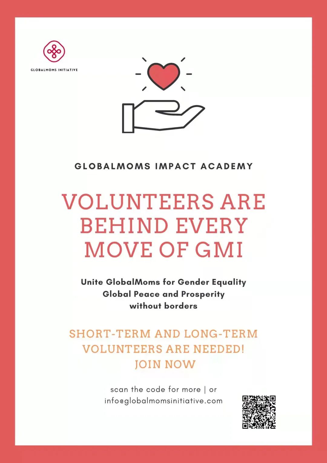 Right now we're in urgent need of volunteers, so we will hold an online Q&A session with potential volunteers through Tencent Meeting Room in early April, for whoever is interested to join the session, please kindly add me (WeChat ID: iamhyxljfamily) or GMI Global Partnership and Program Director Ms. Mari (WeChat ID:mariamski), or send emails to us through info@globalmomsinitiative.com.