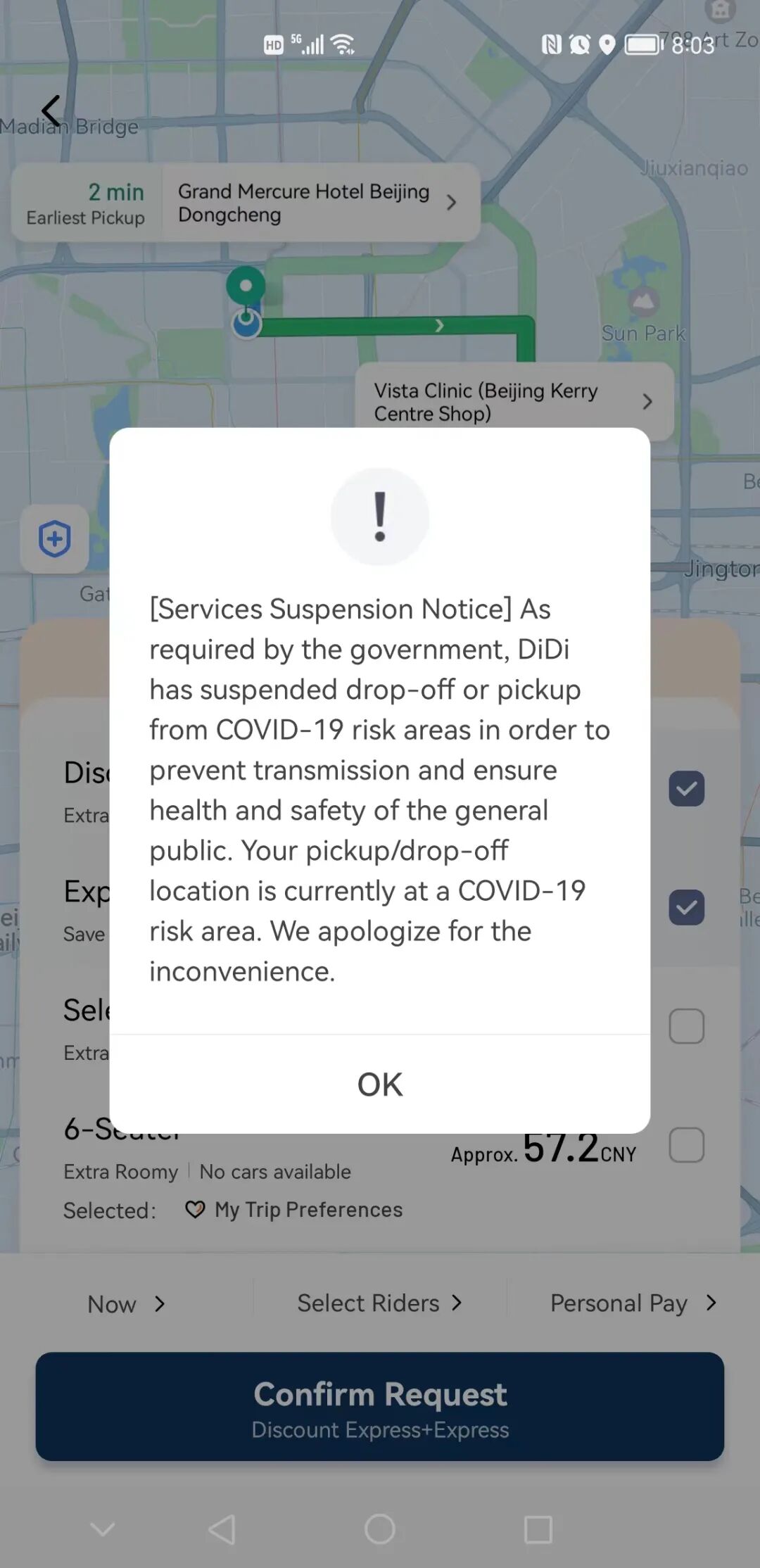 According to local covid regulations, it was announced that taxis and other cars for hire including Didi would not be allowed to take fares from within or going from Shunyi (excluding to and from Beijing Capital Intl. Airport), Fangshan, and parts of Chaoyang to other districts starting May 12.