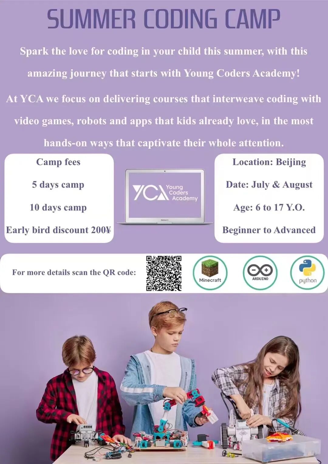 Young Coders Academy (YCA) focuses on delivering courses that interweave coding with video games, robots, and apps that kids already love, in the most hands-on ways that captivate their whole attention! During this summer camp, we will engage in interactive sessions of four hours and lead our students through a super fun process of creation, critical thinking and problem solving, with the end goal of mastering computational skills according to their age level. By joining this year’s summer coding camp, students will have the opportunity to express their creativity and have fun while learning how to create computer games, apps and more!