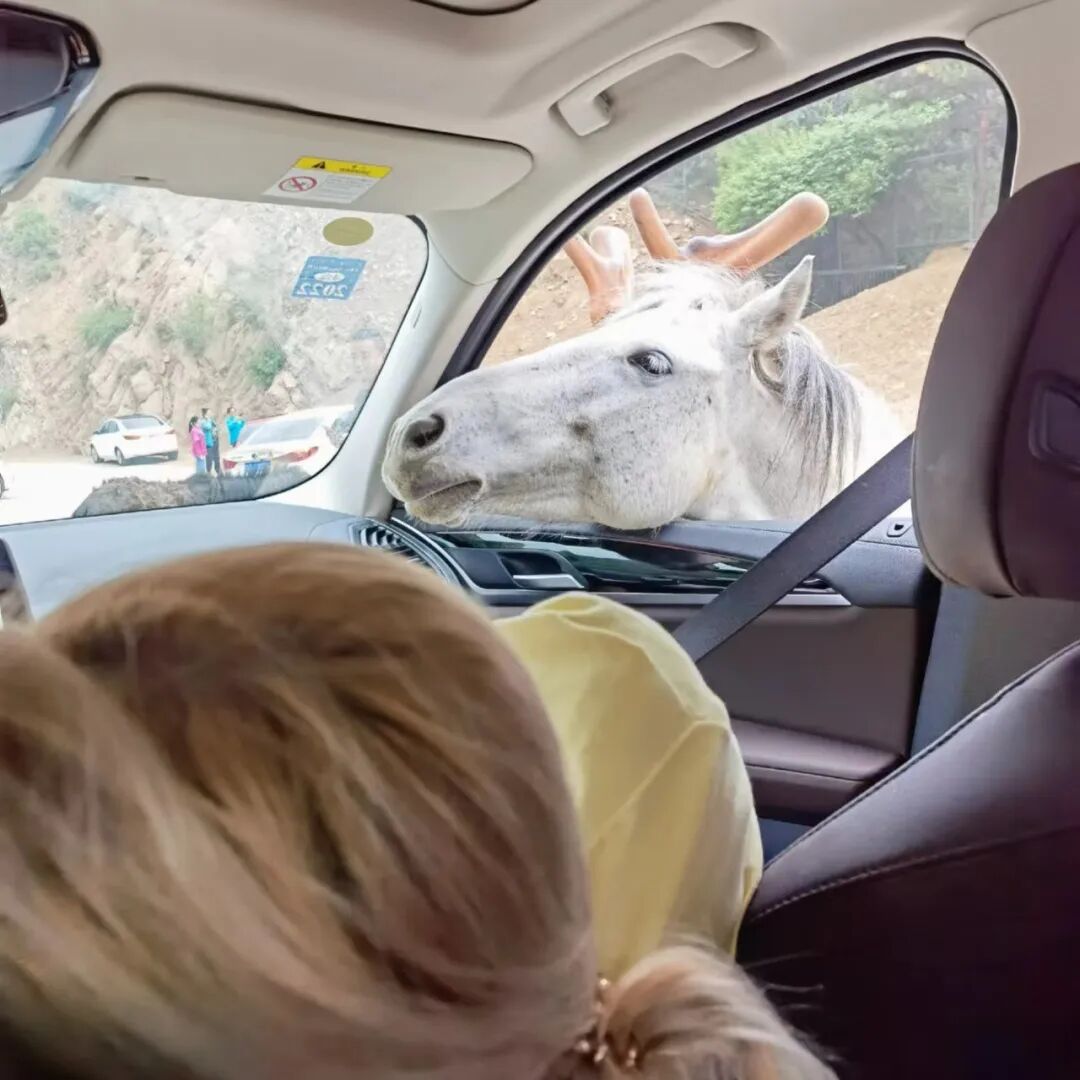 Right before you drive out of Badaling Wildlife Park you’ll come across a section where you can either park and get out of your car, or feed horses and deer right from your window. These animals are super used to people and getting fed. As soon as your car window opens, something curious and hungry is going to wander up looking for snacks. And they’re not shy! If you’ve got veggies they like, these horses and deer are not going to hesitate to stick their heads in for more.