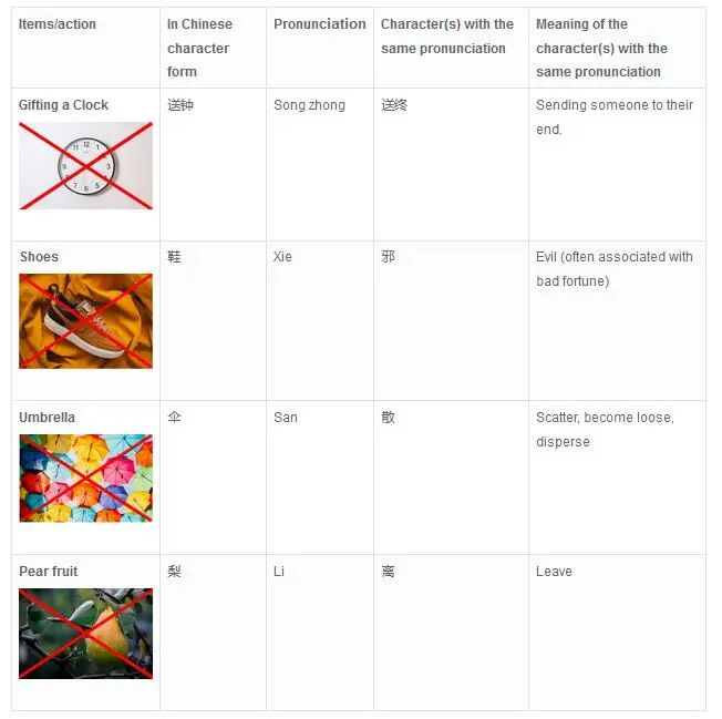 These items are considered taboos in China for various reasons. Of the seven, four items are because their Chinese pronunciation is too similar of other words with opposing meanings and negative connotations as shown below in the graph – which pretty much explains why they don’t make a good present.