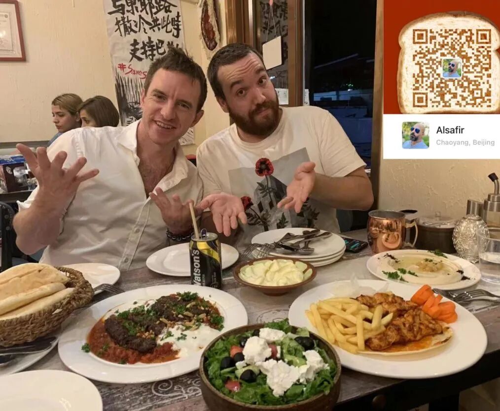 In the spirit of CFFC, some friends and I met up with board members and Beijing foodie royalty Preston Thomas and Ana Lorenco for a quick dinner at one of Thomas’ favorite Beijing restaurants, Al Safir. We were treated to an exceptional meal of fluffy pita bread, grilled meat, falafel, hummus, tomato, pine nut spread, and so much more. I highly recommend checking out this wonderful eatery the next time you are in the mood for the Middle Eastern fair. You can scan the QR code below for info and reservations or just drop in at the address below: