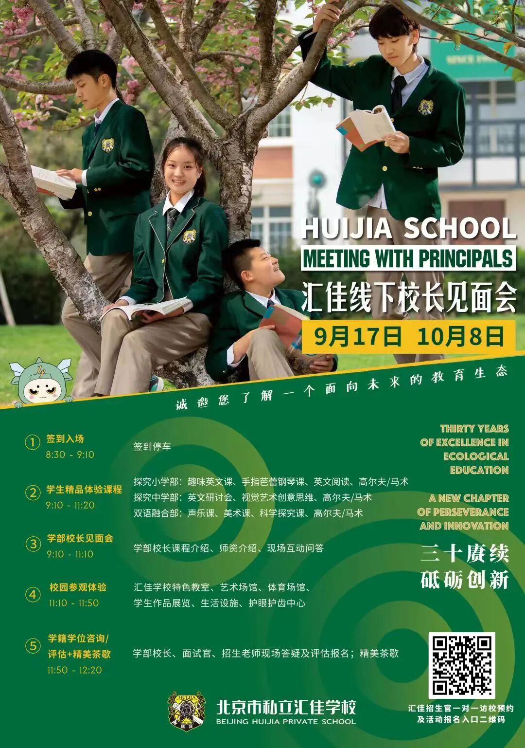 Beijing Huijia Private School invites all prospective students and their families to meet the head of school and learn more about their future-oriented education philosophy on Oct 8. Founded in 1993, Beijing Huijia Private (IB) School is a K-12 day-and-boarding school with three authorized IB programmes (PYP, MYP, and DP), providing an innovative, internationally-focused education whilst maintaining Chinese characteristics.