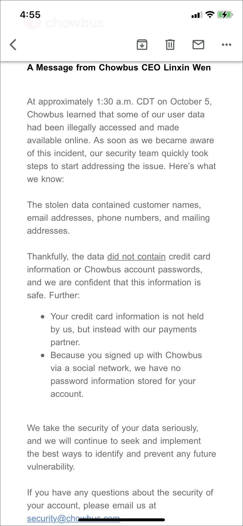 根据Chowbus,公司已经禁用了原始电子邮件的链接。