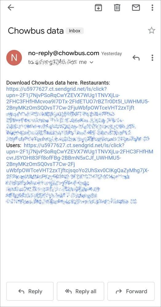周一凌晨,Chowbus的客户开始收到来自“Chowbus”神秘的电子邮件,标题是“Chowbus数据”,上面只是简单地写着:“在这里下载Chowbus数据。”