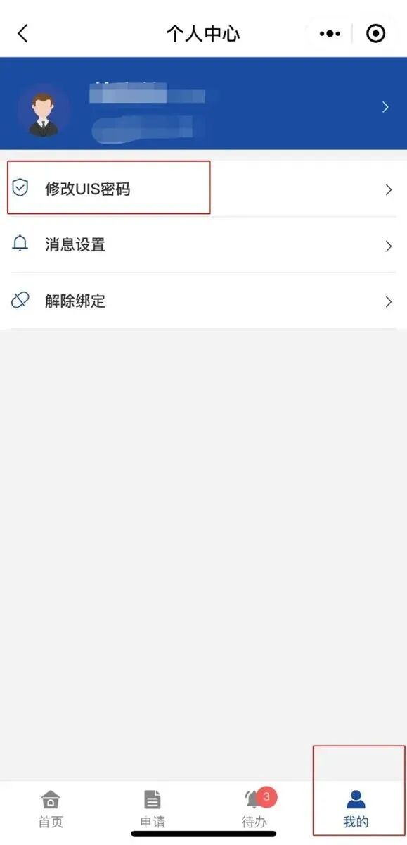 (3)通过“复旦eHall”微信小程序,也可以进行密码的修改和预留手机号的设置。点击”复旦eHall”微信小程序底部的”我的”,进入”修改UIS密码”模块中即可进行设置。