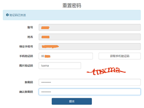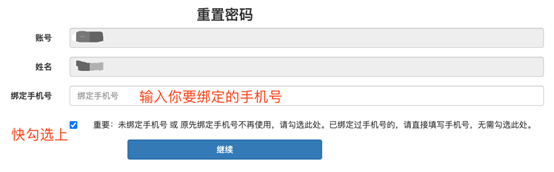 如已绑定过手机号,则输入之前绑定的手机号,点击“继续”。出现如下对话框。在输入正确的手机验证码和图片验证码后,输入您想修改的新密码,并确认提交后,即可完成修改!(PS:密码的设置要求:长度应超过10位,包含大写字母、小写字母、数字、标点符号4种字符中至少3种字符。)