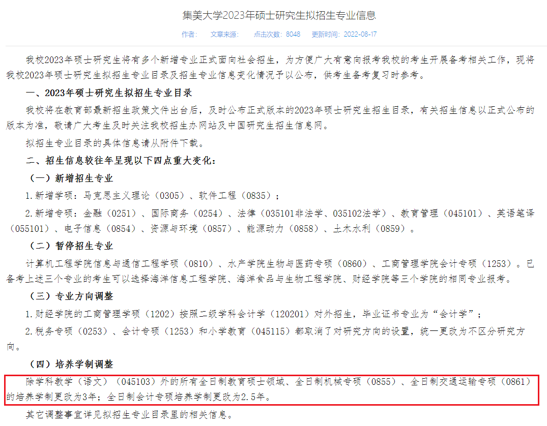 除学科教学(语文)外的所有全日制教育硕士领域、全日制机械专硕、全日制交通运输专硕的培养学制更改为3年;全日制会计专硕培养学制更改为2.5年。