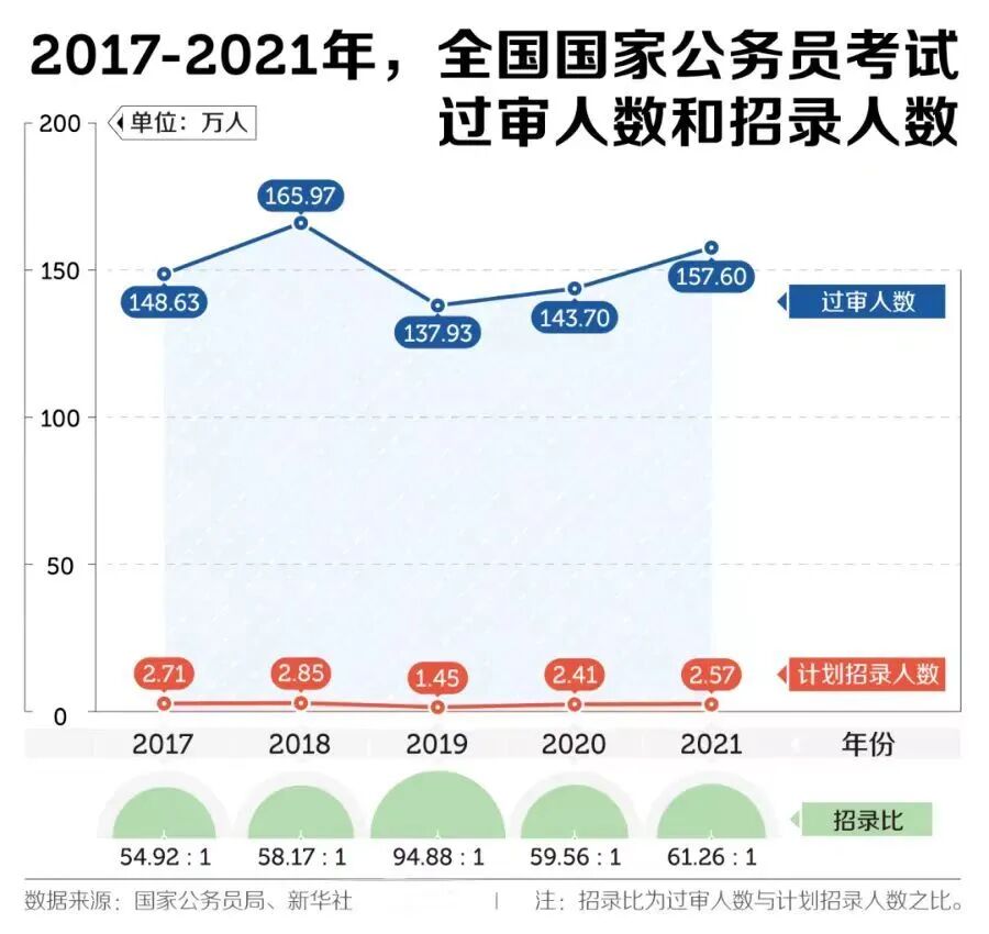 国家公务员局发布公告,2022年共计212.3万人通过了资格审查,实际录用人数有3.12万,报录比高达68:1。