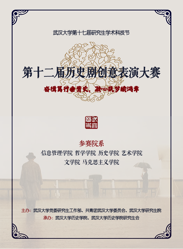 为深入学习贯彻党的二十大精神,坚定历史自信、文化自信,赓续红色血脉、传承奋斗精神,做到学史明理、学史增信、学史崇德、学史力行,由武汉大学党委研究生工作部、共青团武汉大学委员会、武汉大学研究生院联合主办,历史学院承办的武汉大学第十七届研究生学术科技节活动——武汉大学“奋楫笃行垂青史,凝心筑梦续鸿章”第十二届研究生历史剧创意表演大赛于12月7日-12月15日以线上形式顺利举办。将历史场景、历史事件以舞台剧、广播情景剧的形式呈现,通过艺术演绎,探索历史规律、传播人文知识、弘扬民族精神。