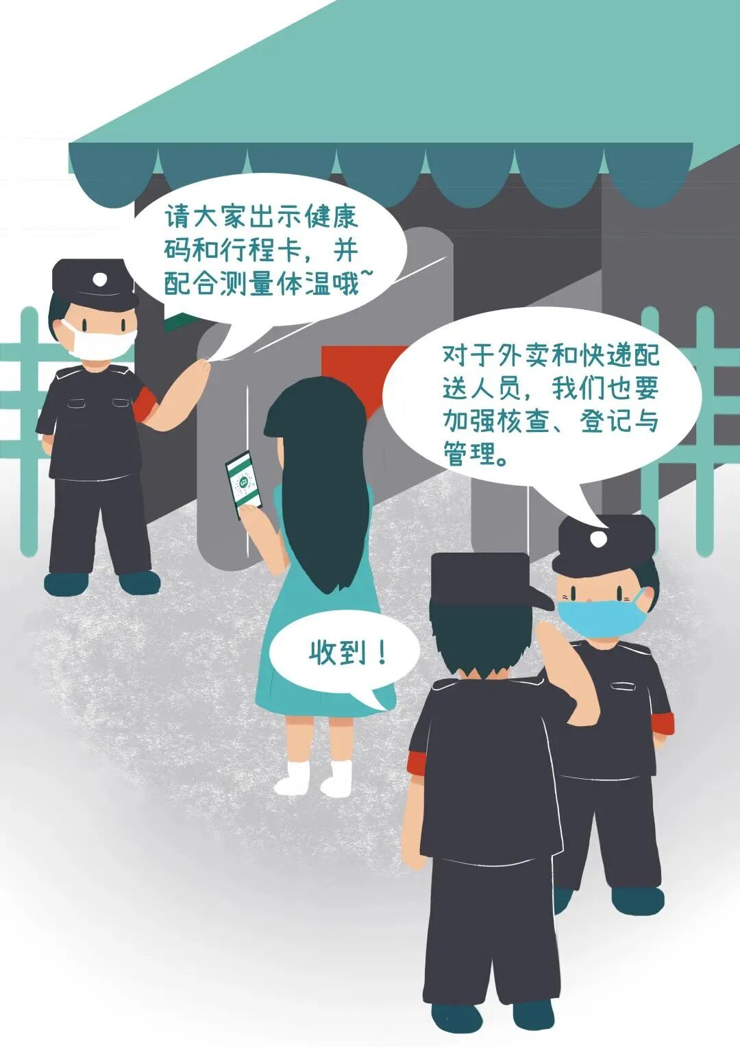 3.加强校门管理。全面把控校园进出通道,做到区域合理、专人负责、登记排查、记录齐全。加强学校通勤车辆管理,所有人员入校时需严格核验身份、测量体温、查看健康码,健康码和体温正常并佩戴口罩者方可进入。加强对外卖配送和快递人员核查、登记与管理。积极运用信息化手段,实施便捷的进出校门管理机制。全面排查出入校漏洞,重点检查围栏损坏处、绿植围挡处、矮墙等人员可通过且无人看管的区域,及时修缮、堵上漏洞。