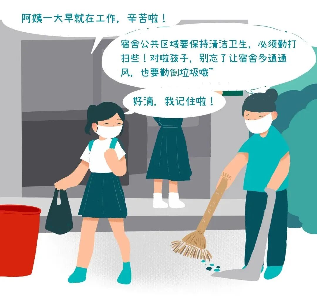 6.加强宿舍管理。学生宿舍严禁外来人员入内,安排专人负责宿舍卫生管理和检查,引导学生在宿舍区不聚集、少串门。宿舍要勤通风、勤打扫,保持厕所和公共区域清洁卫生,洗手设施运行良好,做好垃圾清理和日常公共区域清洁消毒。