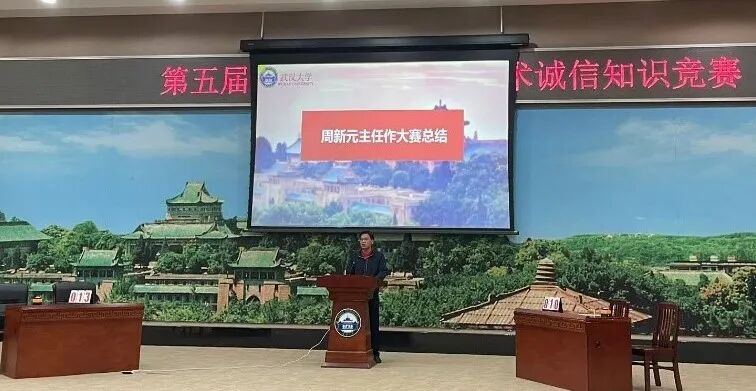 本次活动由武汉大学党委研究生工作部主办,外国语言文学学院、水利水电学院、电气与自动化学院、土木建筑工程学院、新闻与传播学院、资源与环境科学学院联合承办,旨在净化学术氛围、强化广大研究生的诚信意识。外国语言文学学院研究生办公室主任周新元老师、水利水电学院研究生辅导员陈曼雨老师、资源与环境科学学院研究生辅导员李韩老师、新闻与传播学院研究生兼职辅导员李澳老师、土木建筑工程学院研究生兼职辅导员于瀛洋老师、电气与自动化学院研究生兼职辅导员刘运鑫老师莅临决赛现场并担任本次决赛的评委。主办方控制现场人数,符合疫情防控规定。