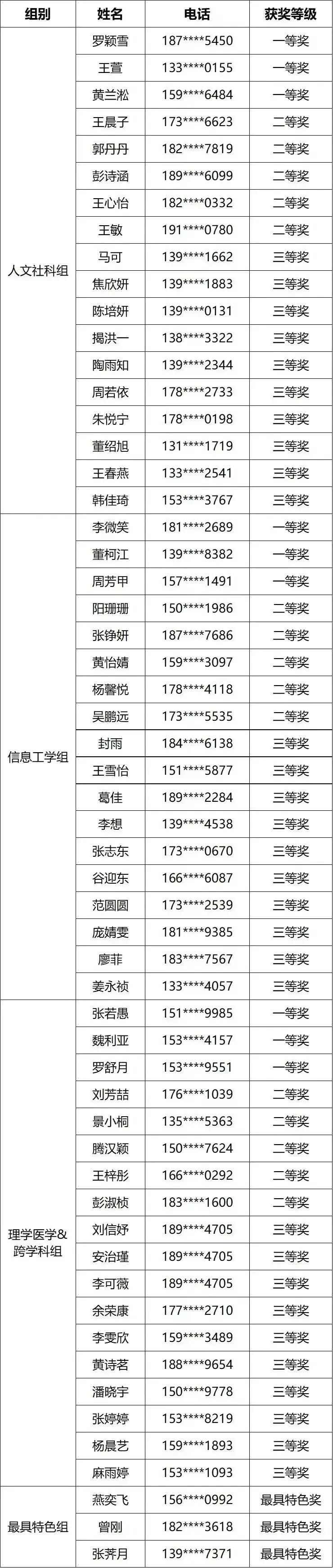 经过严格的前期筛选和激烈的线上投票评比,人文社科组、信息工学以及理学医学组&跨学科组每组各评选出一等奖3名、二等奖5名、三等奖10名,又单独评出最具特色奖3名。获奖名单如下: