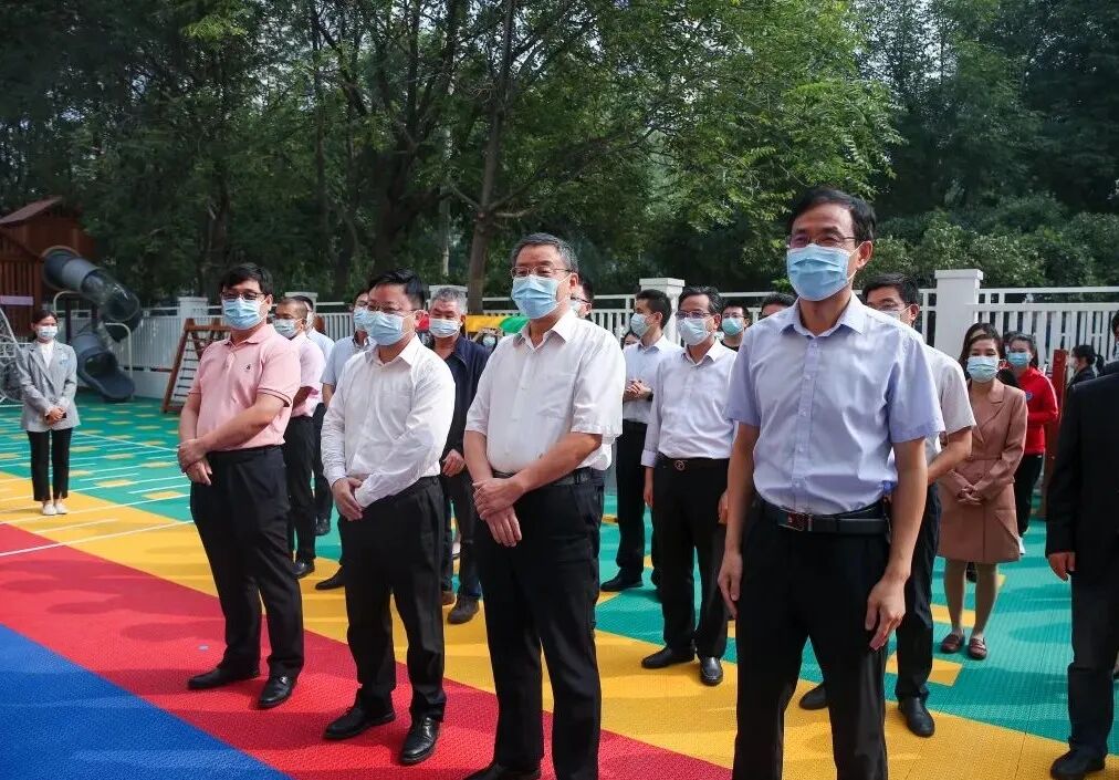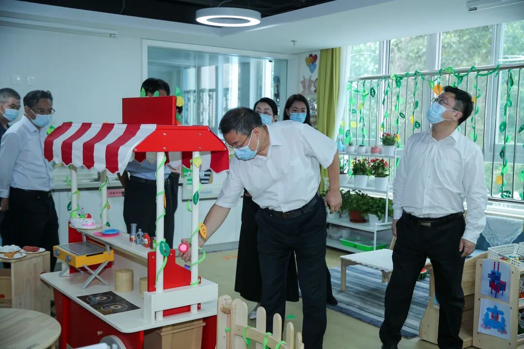 幼儿园教师丁晶带领与会领导嘉宾及家长代表参观幼儿园的室内环境,并进行了详细介绍。武贵龙在参观过程中强调,一定要坚持把师生健康安全放在首位的理念,强化园内安全管理,抓好园内疫情防控,确保教学秩序平稳有序。