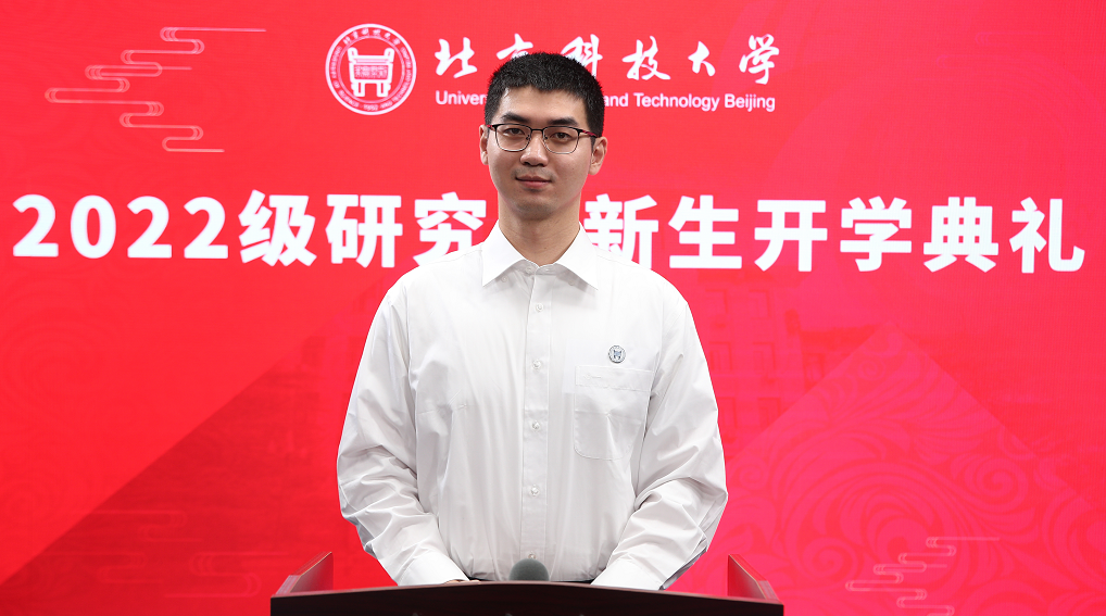 机械工程学院贾子健作为新生代表发言。他回顾了在北科求学的美好记忆,也分享了以崭新的身份在北科大“续航”科研旅程的喜悦与思考。他号召同学们要志存高远开启新程、踔厉奋发探索新知、心怀家国勇攀新峰,牢记党的教诲,立志民族复兴,传承北科精神,全力以赴投身科研事业,用智慧和汗水来浇筑自己的钢筋铁骨,在实现中华民族伟大复兴的历史征程上书写精彩人生。